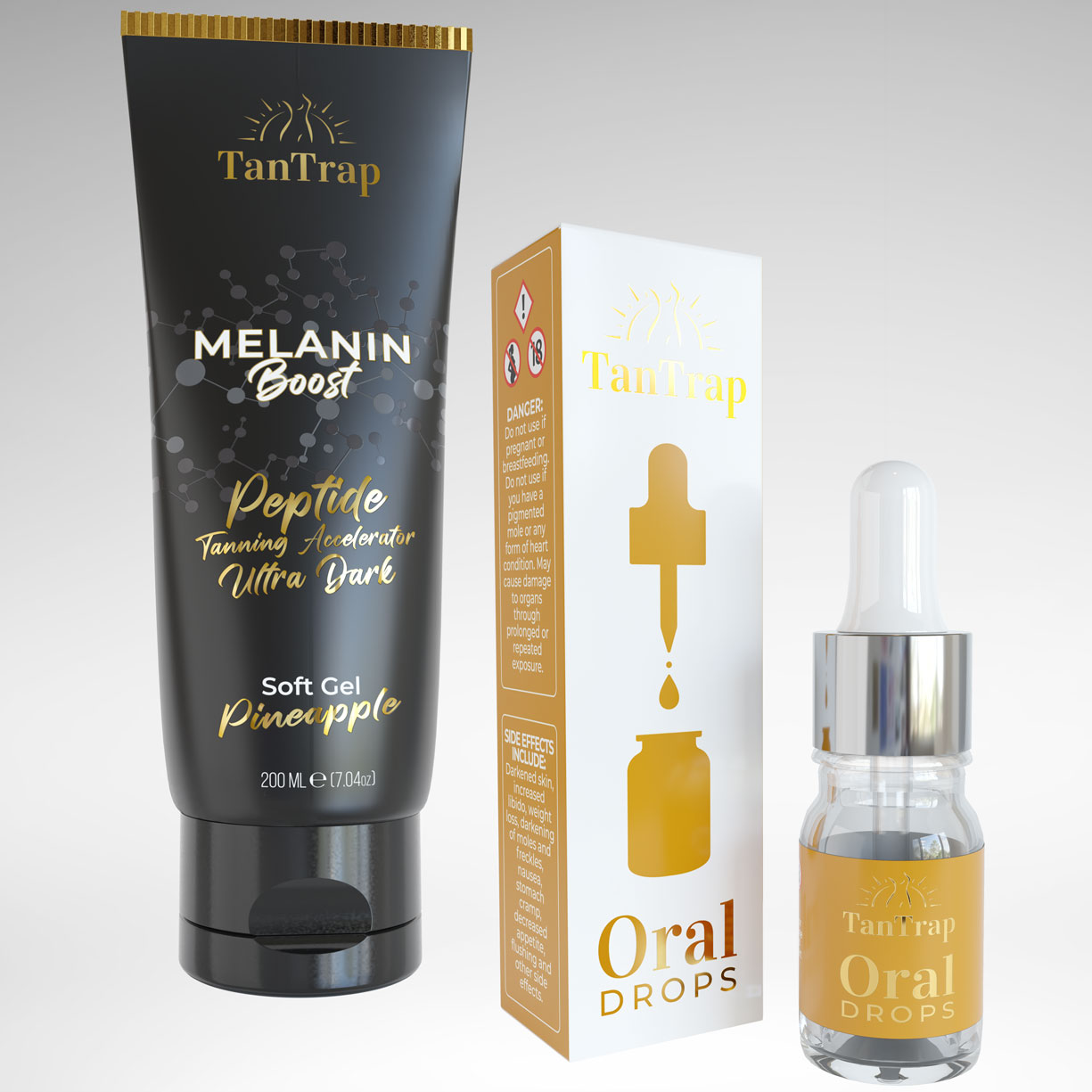 TanTrap Melanin Boost – Ultra Dark Bundle. Achieve a deeper, darker tan with TanTrap’s Melanin Boost – Ultra Dark Peptide Tanning Accelerator. Formulated with octapeptide-5, this advanced tanning accelerator boosts melanin production, helping you achieve a rich, sun-kissed glow with less UV exposure. Suitable for all skin types, it is designed for use in both natural sunlight and artificial UV environments.